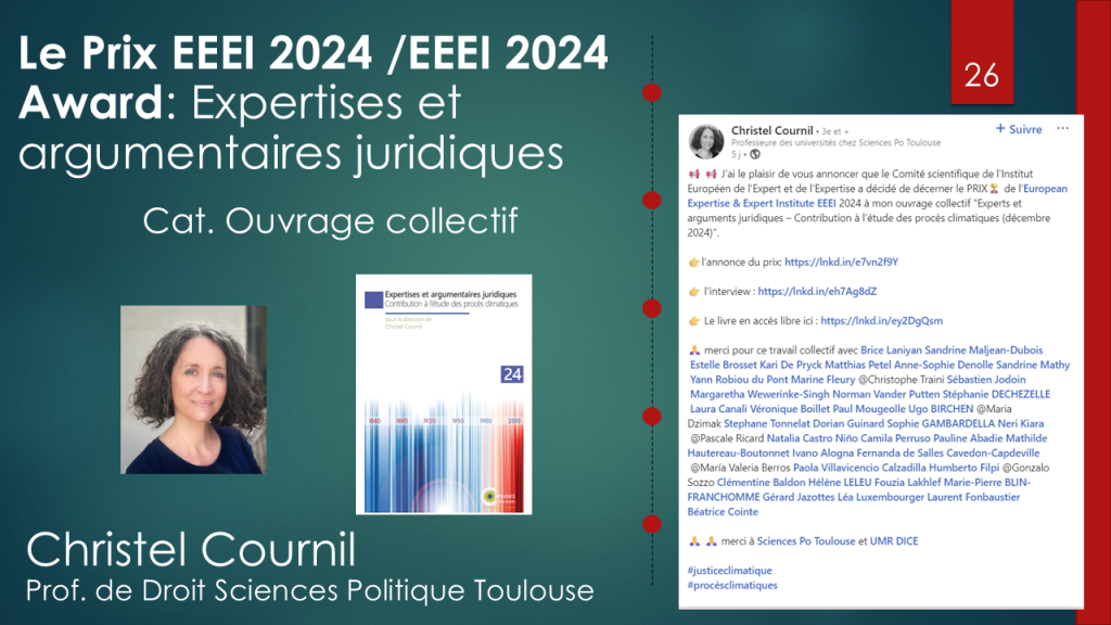 Recognized for a collective work on climate litigation and the role of expertise. The study maps practices, analyzes how expert opinions are produced, and explores their legal, social, and political implications. Christelle was present and outlined the main themes of the book.