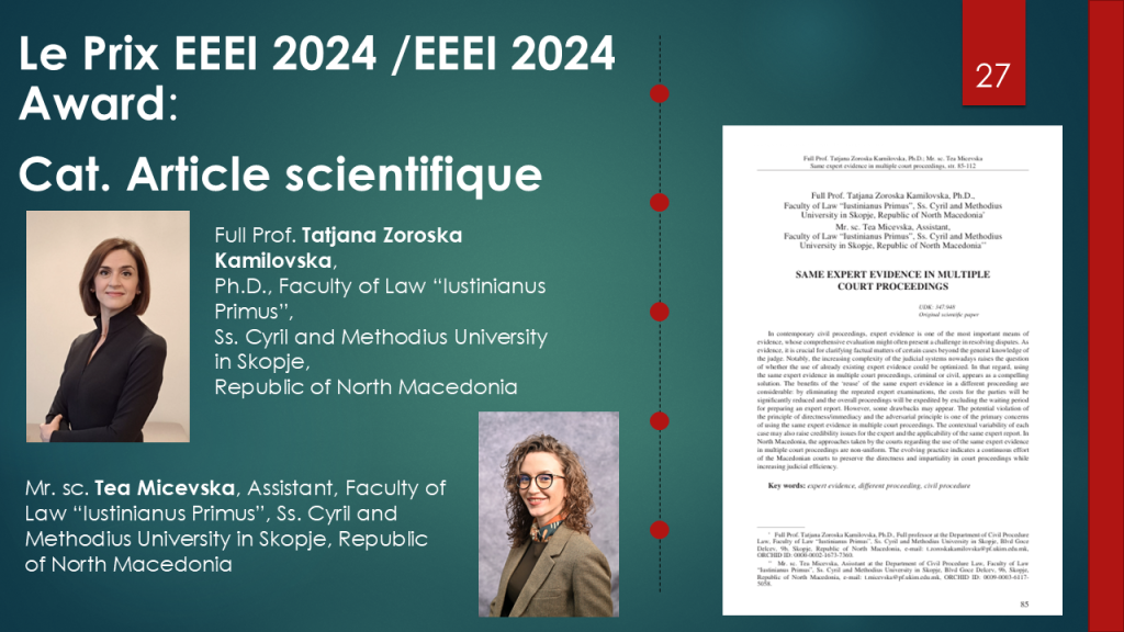 Recognized for an innovative article on the reuse of expert reports in multiple proceedings. Their work proposes explicit regulation to allow this practice while safeguarding procedural rights. Tatjana and Tea presented their conclusions and recommendations for North Macedonia online.