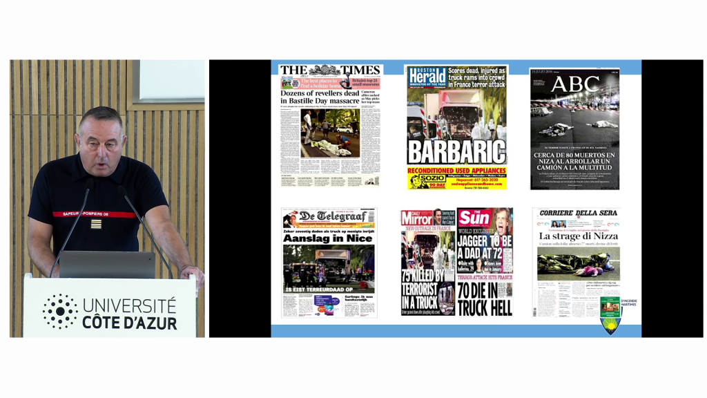 Atelier animé par Alexandre Rodde, chercheur spécialisé sur les questions de terrorisme et de tuerie de masse, avec la participation d’Ingrid Sanders, de la police judiciaire fédérale de Halle-Vilvoorde, site Brussels Airbpot, Belgique, et du Lieutenant Colonel Riquier du SDIS des Alpes Maritimes
