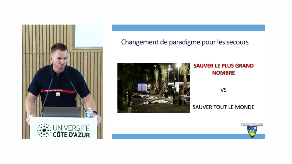 Commandant des opérations de secours sur une opération hors norme, celle de l’attentat du 14 juillet 2016, le lieutenant-colonel Riquier a souhaité « nous partager effectivement son expérience et essayer de nous démontrer en quoi cette opération hors norme a effectivement pu marquer autant peut-être les intervenants que les victimes. Effectivement, l’attentat du 14 juillet 2016 restera parmi les interventions qui ont marqué sa vie de sapeur-pompier, sa vie d’homme. » Il nous en a décrit la méthodologie de A à Z, l’importance de la traçabilité des opérations, le rôle du commandement qui a été le sien.