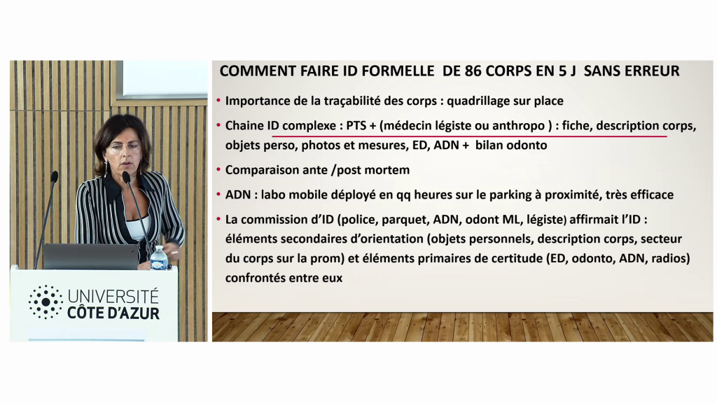 Véronique Alunni était directrice adjointe de l’Institut de médecine légale du CHU de Nice à l’époque des attentats du 14 juillet. Elle a dû, à la demande du parquet antiterroriste, dans un délai de 5 jours, identifier 86 victimes et déterminer les causes de leur décès, dans un délai de 5 jours. Elle témoigne : « Et on a une des plus belles choses qu’on a vécues dans cet attentat, c’est l’entraide, parce que énormément de personnes de la France entière sont venues à Nice pour nous aider à faire les autopsies. Des médecins, des secrétaires. Et, on a même enrôlé pour la première fois en France et peut-être au monde, les étudiants en médecine pour participer. » Le processus d’identification est complexe. Les relations avec les familles, la justice, les médias, pas toujours simples.