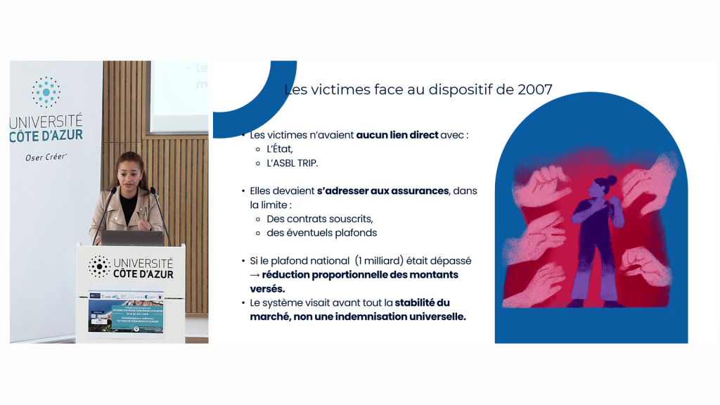 Valérie Gérard nous a présenté le modèle belge d’indemnisation des victimes du terrorisme, reposant sur la loi du 3 mai 2024 qui est venue combler le vide juridique et permettre l’indemnisation de toutes les victimes, quel que soit le mode opératoire ou le lieu.